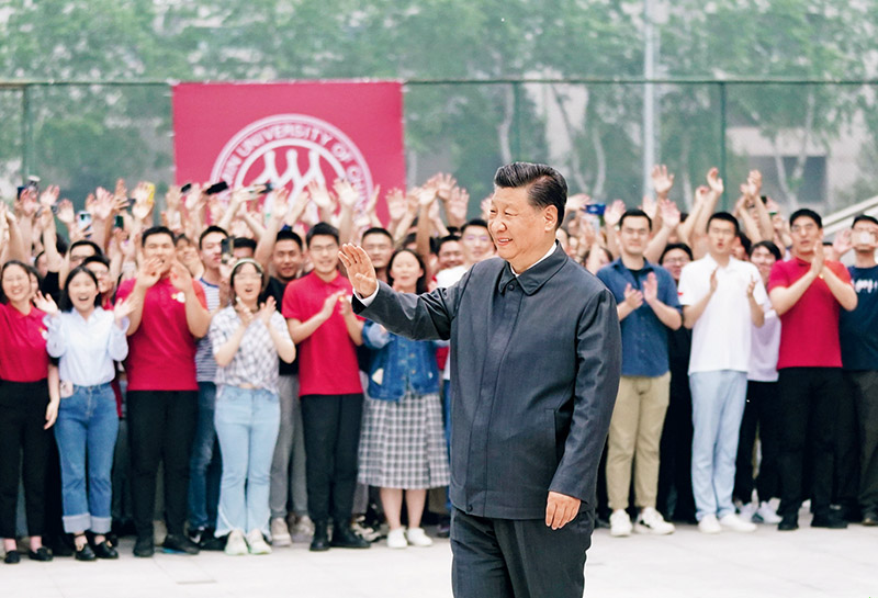 2022年4月25日上午,中共中央总书记、国家主席、中央军委主席习近平来到中国人民大学考察调研。这是习近平向师生们挥手致意。 新华社记者 谢环驰/摄